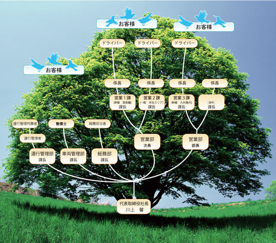大成運輸は、お客様へ確実にお荷物が届くような、運行体制組織を構成しています。お客様(鳥) 社員(葉)と家族(実)を木にたとえて、一つの大きな組織と考えています。